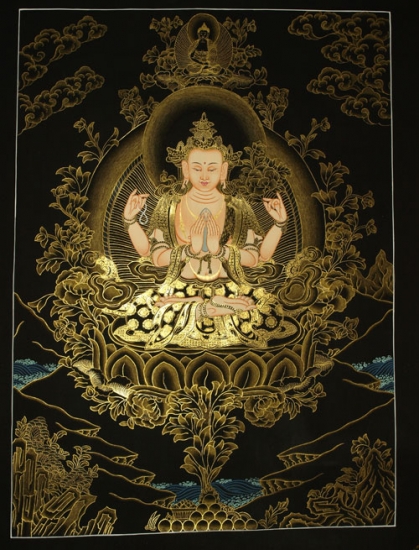 AVALOKITESVARA Avalokitesvara is known as Avalokitesvara in Nepal and India, Kuan – yin in China and Kannon in Japan, is the bodhisattva of infinite loving kindness and compassion for all beings. Next to the historical Buddha, he is probably the most revered of all Buddhist figures. His first hands are pressed together on wish fulfilling jewel at his heart supplicating all buddhas and bodhisattvas to look after sentient beings and protect them from suffering. His other hand holds a crystal rosary symbolizing his ability to liberate being from samsara with ideal means, and reminding the practitioner to recite his six – syllable mantra, OM MANI PAD ME HUM. In his left hand he holds the stem of utpala flower symbolizing his stainless and compassionate bodhichitta motivation. The mantra OM MA NI PAD ME HUM is interpreted as follows: through the blessing of Guru Avaloketesvara and the combined practice of method and wisdom, our ordinary body, speech and mind are transformed and we attain the full enlightenment of the five Buddha families.