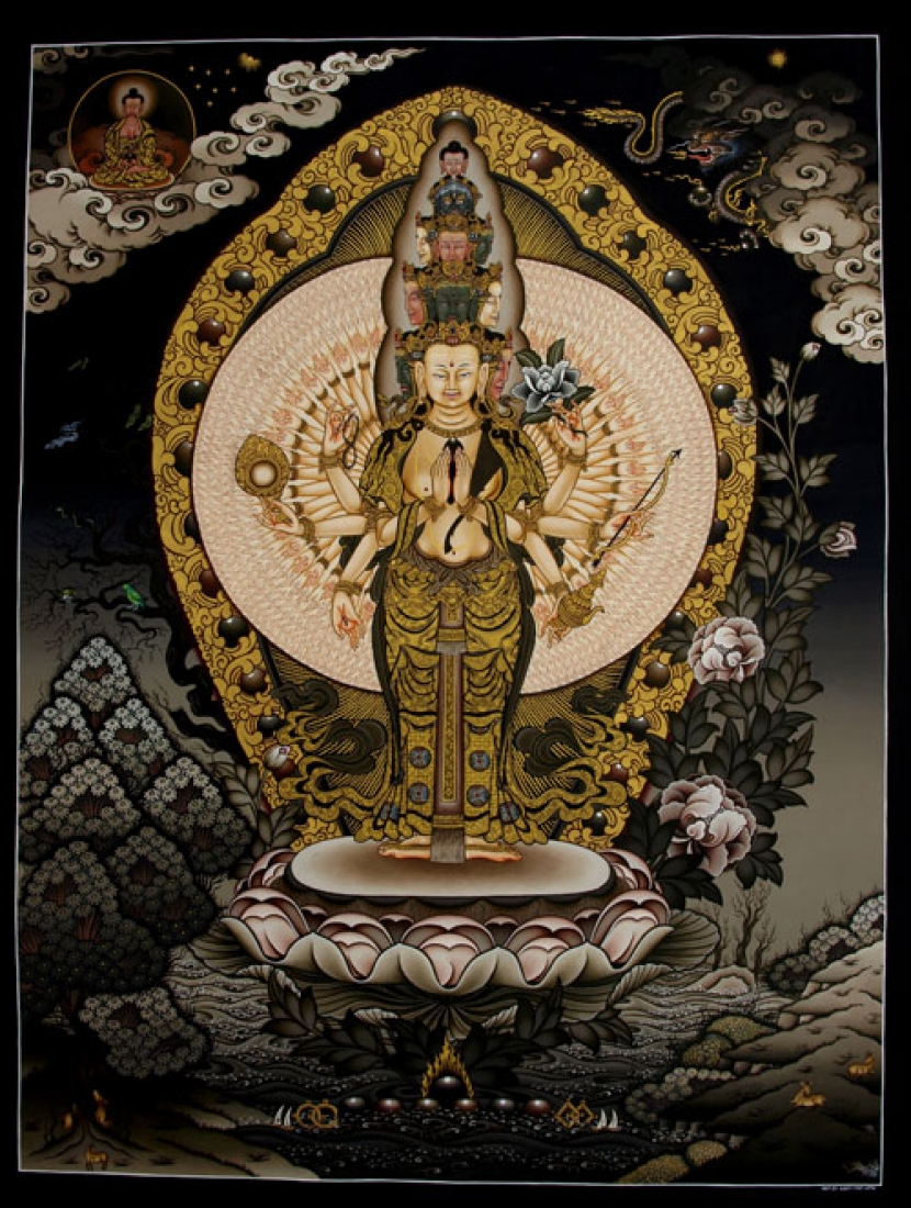 AVALOKITESVARA Avalokitesvara is known as Avalokitesvara in Nepal and India, Kuan – yin in China and Kannon in Japan, is the bodhisattva of infinite loving kindness and compassion for all beings. Next to the historical Buddha, he is probably the most revered of all Buddhist figures. His first hands are pressed together on wish fulfilling jewel at his heart supplicating all buddhas and bodhisattvas to look after sentient beings and protect them from suffering. His other hand holds a crystal rosary symbolizing his ability to liberate being from samsara with ideal means, and reminding the practitioner to recite his six – syllable mantra, OM MANI PAD ME HUM. In his left hand he holds the stem of utpala flower symbolizing his stainless and compassionate bodhichitta motivation. The mantra OM MA NI PAD ME HUM is interpreted as follows: through the blessing of Guru Avaloketesvara and the combined practice of method and wisdom, our ordinary body, speech and mind are transformed and we attain the full enlightenment of the five Buddha families.