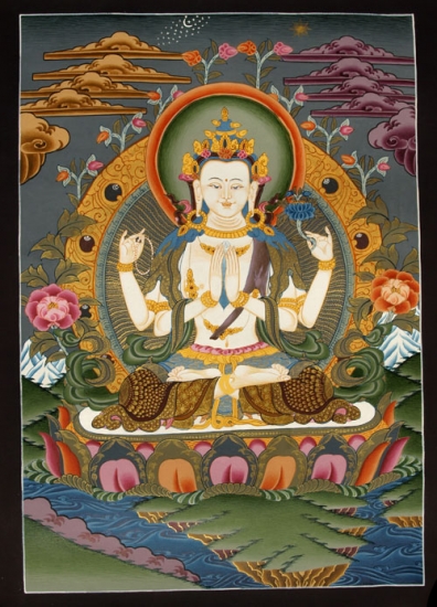 AVALOKITESVARA Avalokitesvara is known as Avalokitesvara in Nepal and India, Kuan – yin in China and Kannon in Japan, is the bodhisattva of infinite loving kindness and compassion for all beings. Next to the historical Buddha, he is probably the most revered of all Buddhist figures. His first hands are pressed together on wish fulfilling jewel at his heart supplicating all Buddhas and Bodhisattvas to look after sentient beings and protect them from suffering. His other hand holds a crystal rosary symbolizing his ability to liberate being from samsara with ideal means, and reminding the practitioner to recite his six – syllable mantra, OM MANI PAD ME HUM. In his left hand he holds the stem of utpala flower symbolizing his stainless and compassionate bodhichitta motivation.