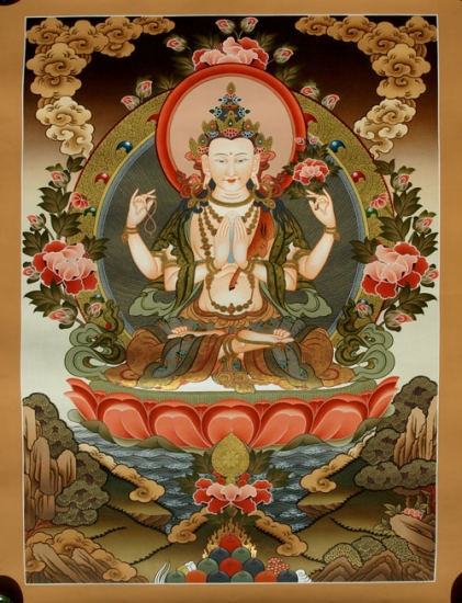AVALOKITESVARA Avalokitesvara is known as Avalokitesvara in Nepal and India, Kuan – yin in China and Kannon in Japan, is the bodhisattva of infinite loving kindness and compassion for all beings. Next to the historical Buddha, he is probably the most revered of all Buddhist figures. His first hands are pressed together on wish fulfilling jewel at his heart supplicating all Buddhas and Bodhisattvas to look after sentient beings and protect them from suffering. His other hand holds a crystal rosary symbolizing his ability to liberate being from samsara with ideal means, and reminding the practitioner to recite his six – syllable mantra, OM MANI PAD ME HUM. In his left hand he holds the stem of utpala flower symbolizing his stainless and compassionate bodhichitta motivation.